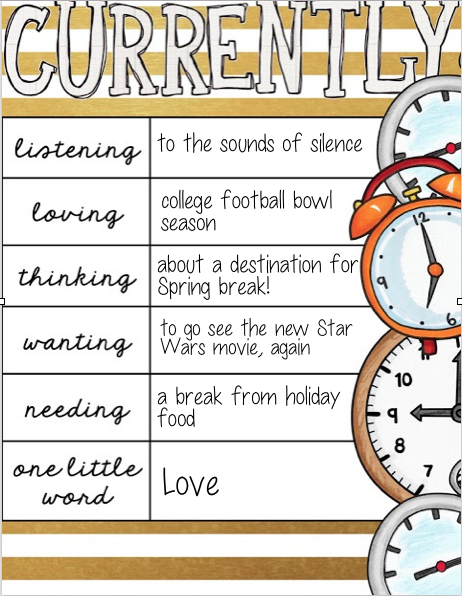 Needing: a break from holiday food. First there was all the treats I got from students for Christmas. Then it was food at my mom’s, dad’s, and in-laws for Christmas. Then it was the New Year’s Eve spread. Did I really just eat three of those mini cheesecakes? Everywhere I go there seems to be temptation. One Little word: Love. Like the Beatles said, it’s all you need.