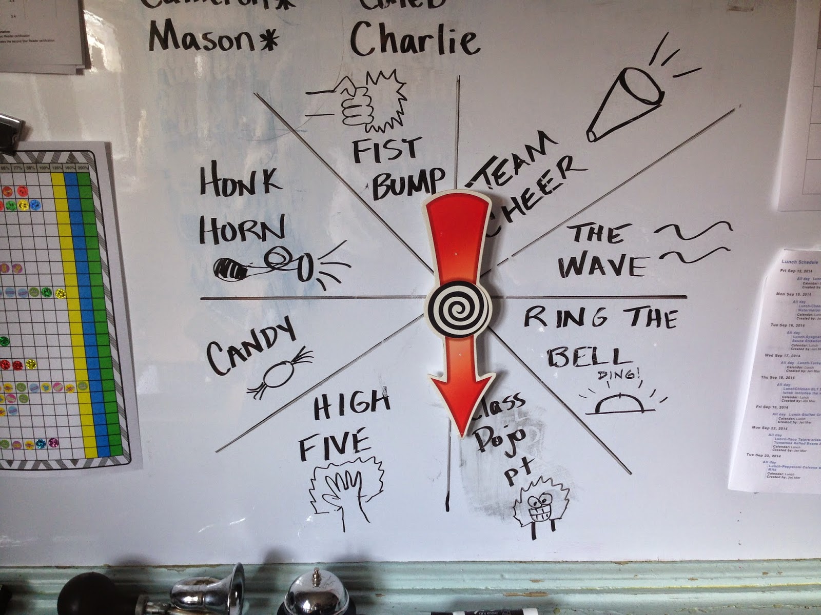 Here is a magnetic spinner I use on my dry erase board for when I want to add some randomness to a game. In this case, the spinner was for “prizes” when a player answered correctly.