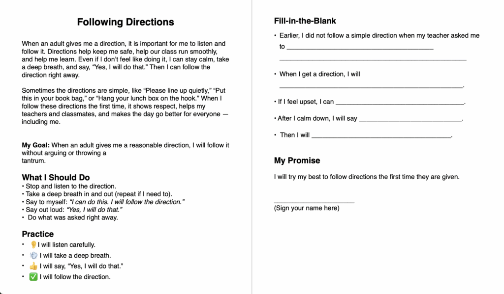 But, be sure to follow up with lesson on the behavior that the student is struggling with. If you’re having trouble coming up with what to do, Chat GPT/Google Gemini are great at creating social stories for kids to read with you and use as a discussion starter. Here’s an example 2-pager I made for a student struggling with following my directions using Chat GPT in about 5 minutes before school. It even added the emojis for formatting in its 2nd attempt.